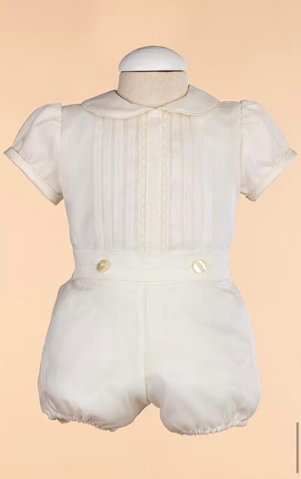 Die dazu passenden Puffhosen mit elastischem Saum runden das Ensemble harmonisch ab. Dieses zeitlose Outfit eignet sich nicht nur perfekt für Taufen, sondern auch für festliche Anlässe wie Hochzeiten – ein stilvolles und zugleich bezauberndes Kleidungsstück für kleine Blumenjungen.