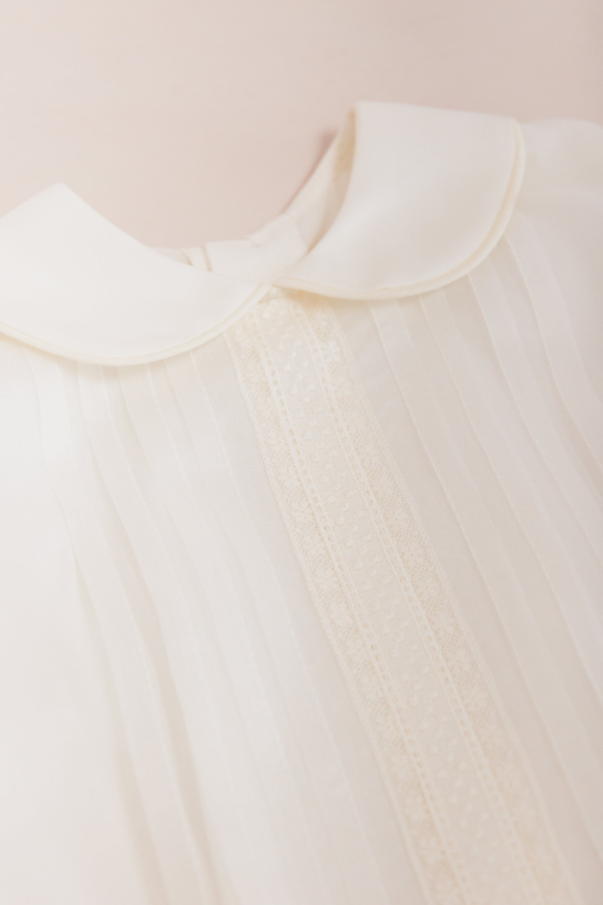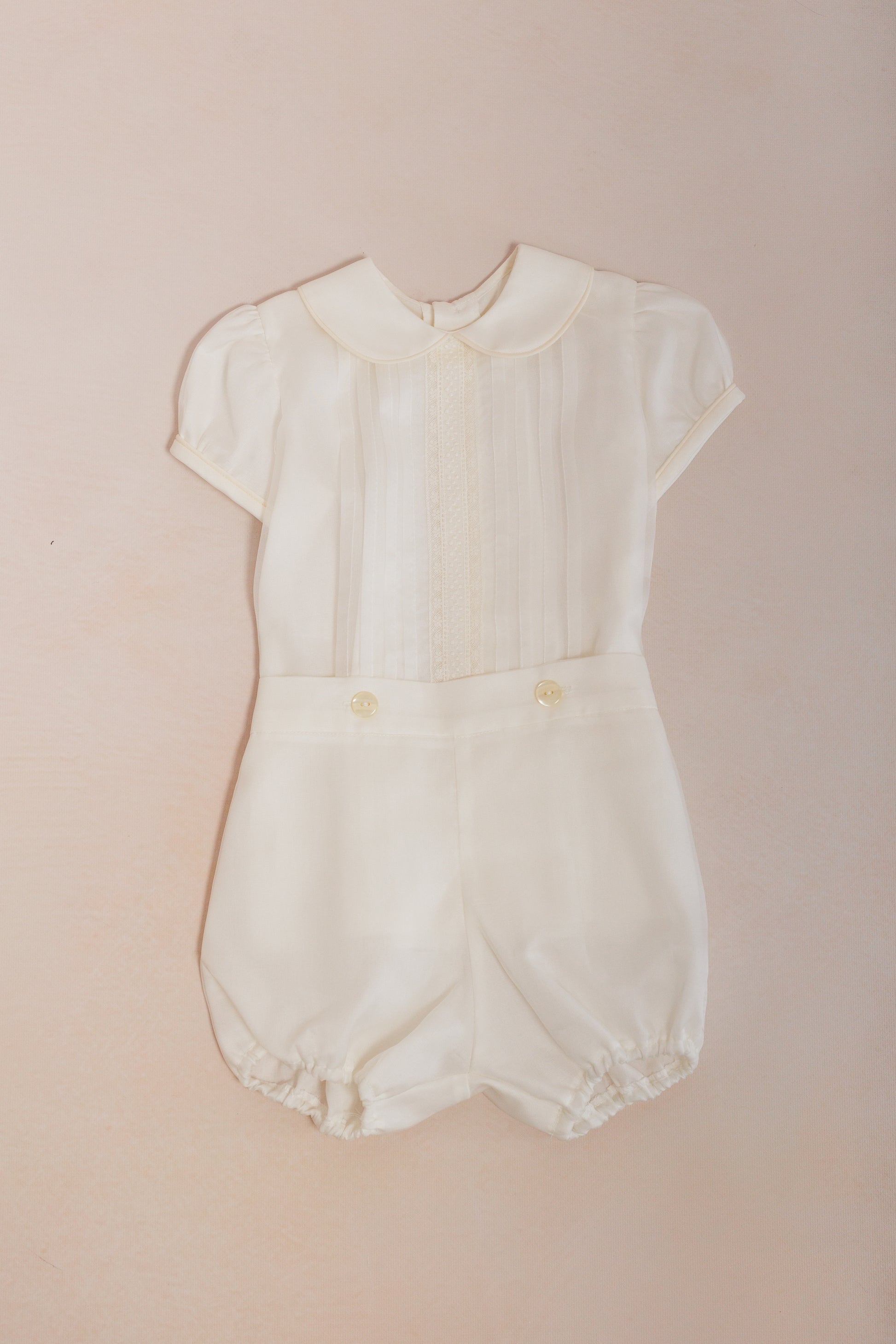 Paired with coordinating puffed bloomers with an elasticated hem, this timeless ensemble is perfect not only for christenings and baptisms, but also for weddings—making a beautifully refined outfit for little flower boys.