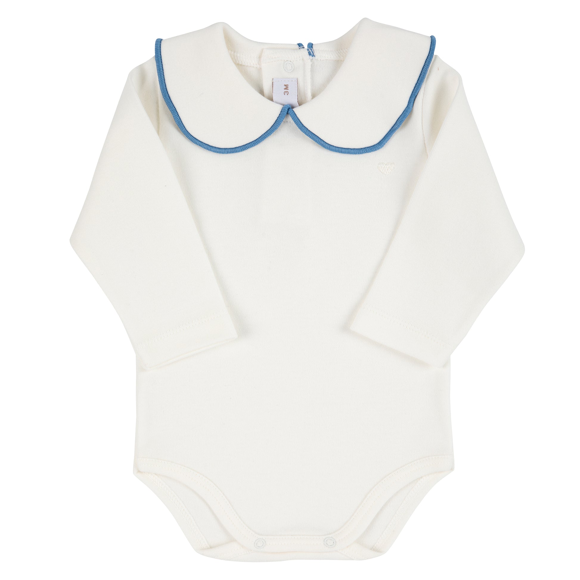 Charming and versatile, the Little Love Bodysuit is a sweet staple for your little one’s wardrobe. Crafted from 100% cotton for a soft and breathable feel, it features a classic round neck and a delicate collar trimmed with a French blue border, adding a subtle touch of elegance. The clean silhouette and gentle detailing make it perfect for both everyday wear and special occasions. Designed with easy snap fastenings, it ensures quick changes while combining comfort, practicality, and timeless style.