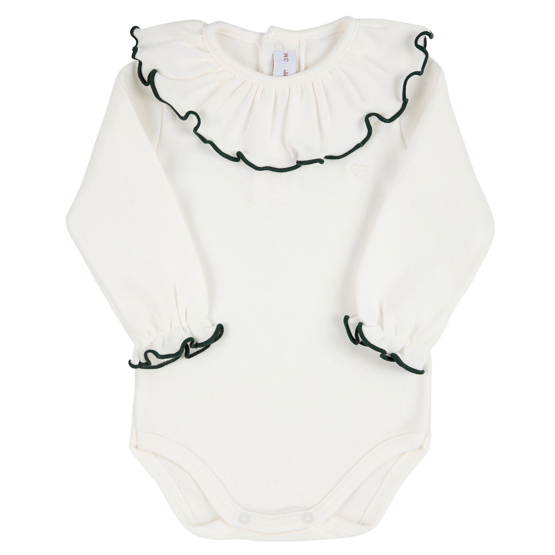 Elegant and timeless, the Graceful Scallop Collar Bodysuit is a refined essential for little wardrobes. Crafted from 100% cotton for softness and comfort, it features a beautifully scalloped collar in bottle green that adds a touch of heritage charm. Gentle gathers and a classic silhouette give this piece subtle texture and sophistication, while long sleeves provide warmth for cooler days. Designed with convenient clasp fastenings, it blends traditional style with everyday ease—perfect for layering or wearing on its own.